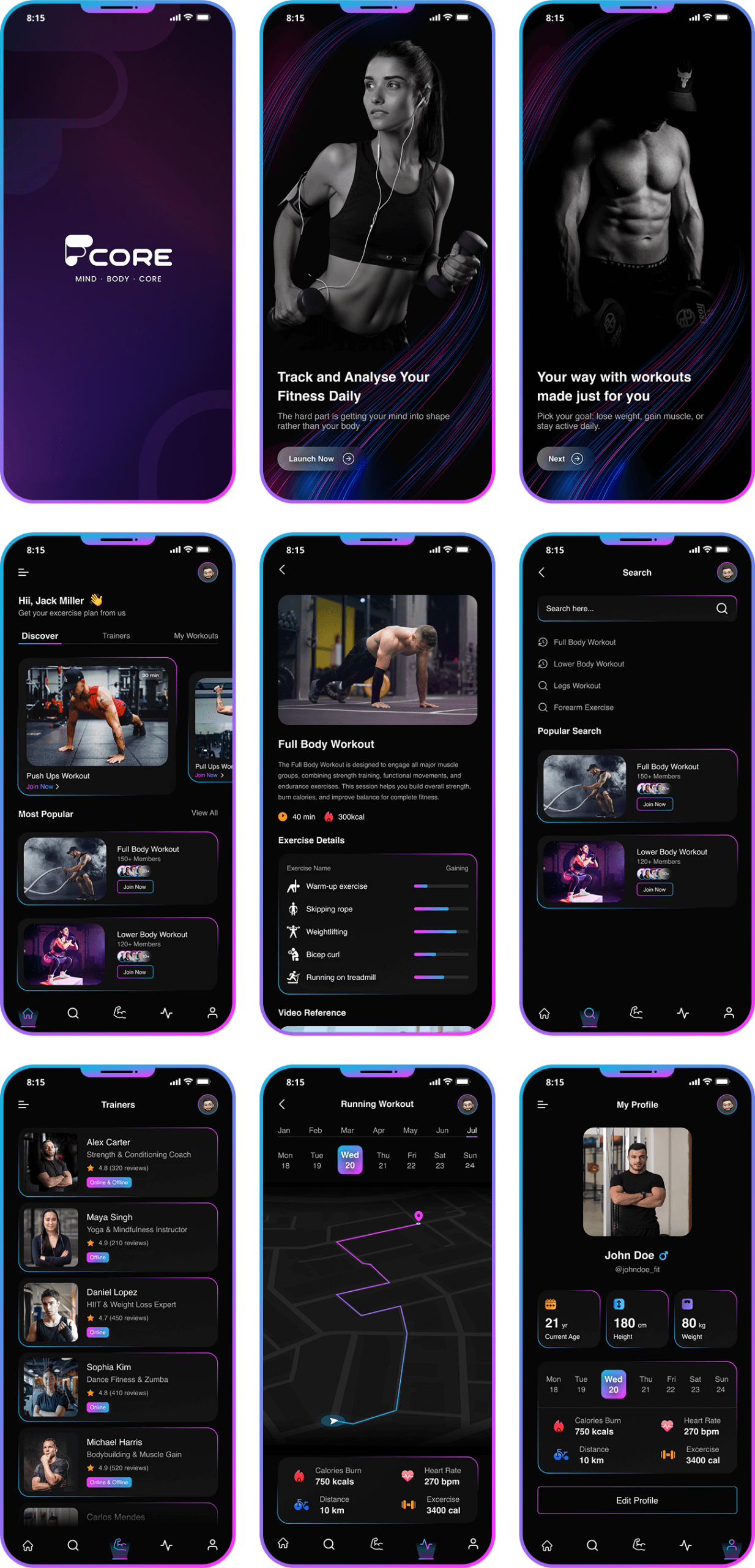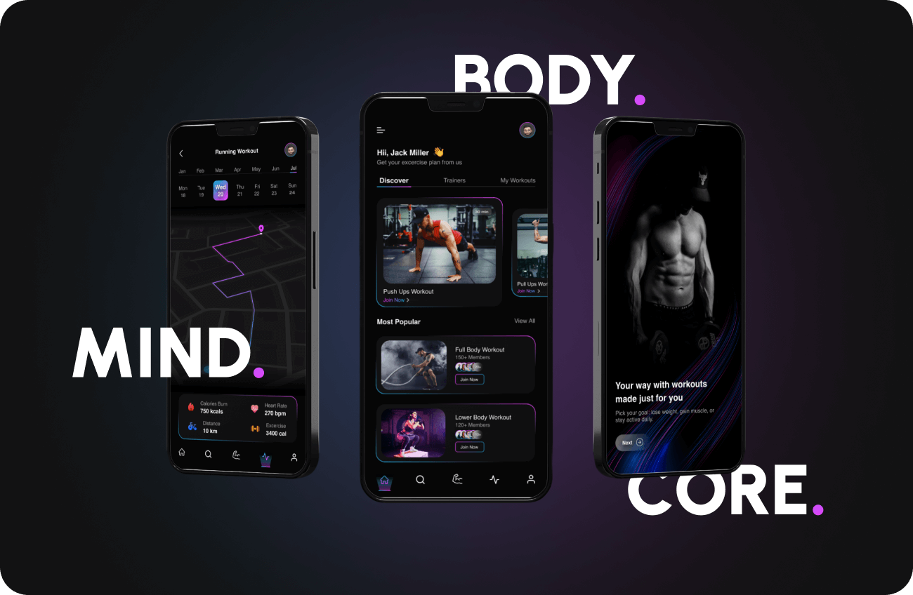 Our app design showcases clean layouts, bold visuals, and intuitive navigation to create a seamless fitness experience.